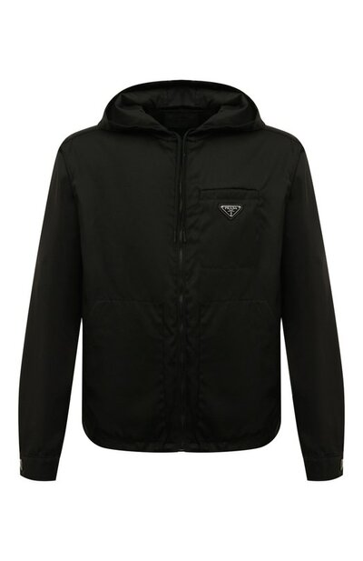 Черная ветровка защитит от капризов погоды межсезонья. Для пошива модели с объемным капюшоном использовали прочный непродуваемый материал Re-Nylon, изготовленный из переработанного пластика. Сырье для его производства собрали в океане, уменьшив загрязненность планеты. Миучча Прада деликатно обозначила принадлежность изделия бренду, украсив его небольшим треугольным элементом с логотипом.