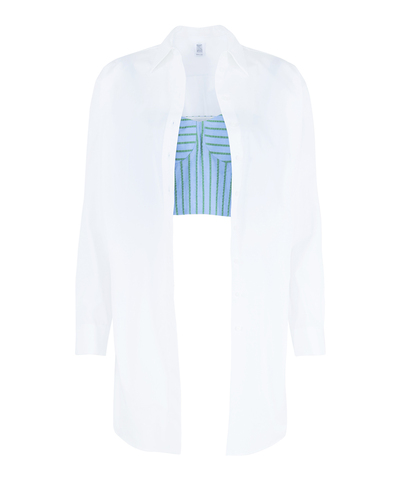 Рубашка из хлопка белого цвета. Модель прямого силуэта с застежкой на пуговицы и отложным воротником. В комплекте топ корсетного вида.
