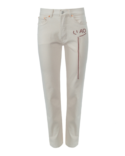 Джинсы из хлопкового денима молочного оттенка. Модель прямого силуэта с высокой посадкой и застежкой на молнию и пуговицу. Изделие дополнено нестандартной вышивкой.