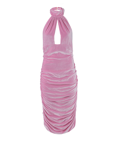 Бархатное платье с добавлением шелка в розовом оттенке. Облегающее изделие со сборкой материала и открытой спиной.