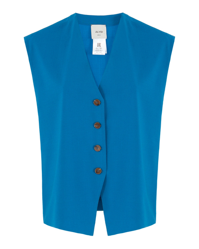 Жилет из костюмной шерсти синего оттенка. Модель четкого кроя с застежкой на пуговицы.