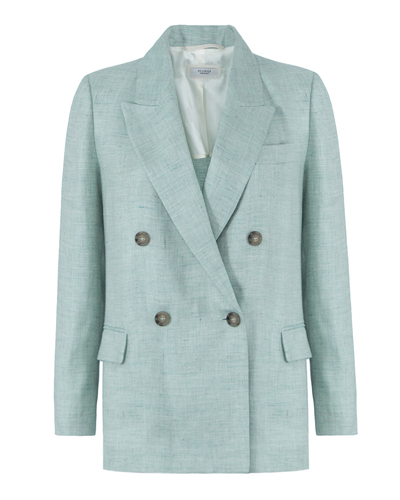 Костюмный жакет изо льна светло-голубого оттенка. Модель прямого силуэта с застежкой на пуговицы дополнена прорезными карманами с планкой.