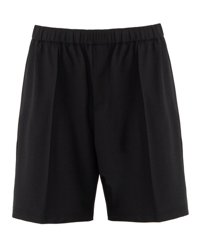 Мужские шорты из костюмной полушерсти черного цвета. Модель прямого силуэта со стрелками и высокой посадкой на талии с эластичной линией пояса.