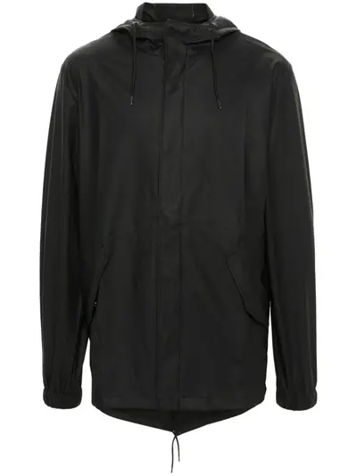 jet black faux leather coated finish fishtail design lightweight construction waterproof windproof drawstring hood high neck front press-stud and zip fastening two side flap pockets long sleeves elasticated cuffs drawstring hem When buying this unisex item, keep in mind that it is graded in standard men's sizing.