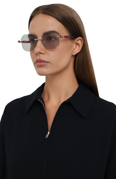 Эти солнцезащитные очки сделали без оправы, поэтому слегка затемненные прямоугольные линзы выглядят невесомо. Детали соединили между собой узким мостом, а после металлическими шарнирами на них закрепили ацетатные дужки из словно отшлифованного до идеальной гладкости гранита белого и черного цветов. Такой аксессуар подчеркнет характер обладателя — как мужчины, так и женщины и позволит продемонстрировать сдержанную индивидуальность.