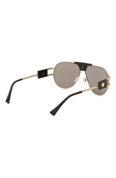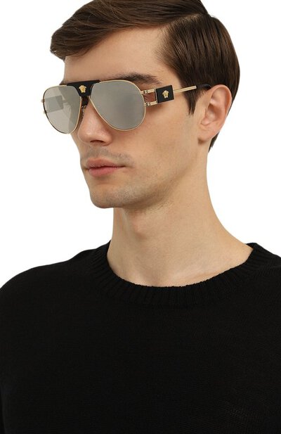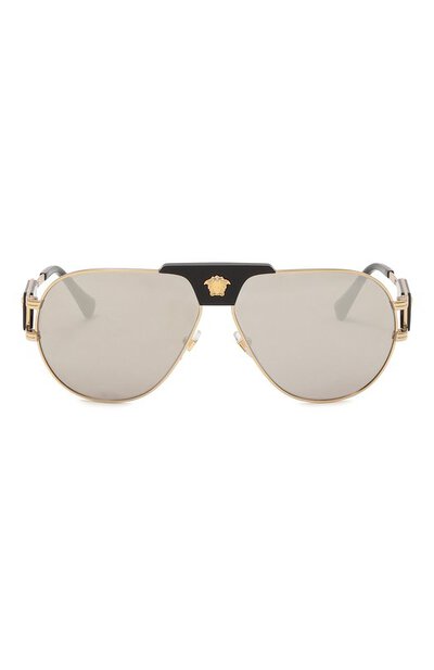 Дизайн этих авиаторов со 100-процентной защитой глаз от ультрафиолета построен на контрасте двух благородных металлических оттенков. Зеркальный блеск превращает серые линзы в серебристые, а покрытие наделяет узкую стальную оправу золотистым сиянием. Гамму поддерживает эмблема в виде головы горгоны Медузы на черном полимерном мосте и вставках на дужках.