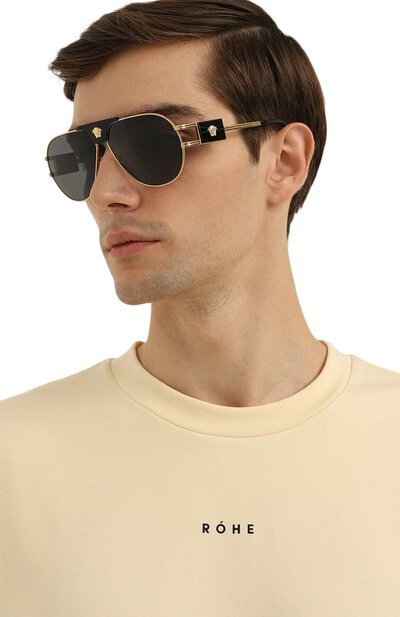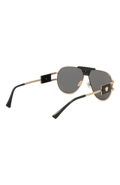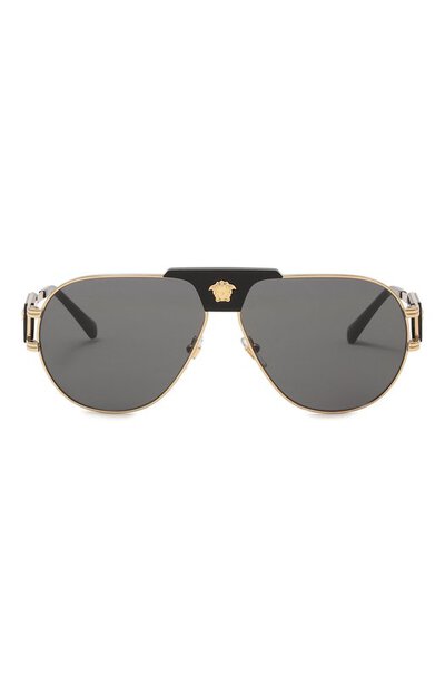 Мост этих авиаторов с тонкой стальной оправой скрывает черная полимерная накладка с яркой трехмерной головой горгоны Медузы. Фирменный декор повторяется на крупных прямоугольных вставках, которые украшают двойные петли на дужках. С контрастными деталями перекликаются темно-серые линзы, которые на 100% отсекают лучи ультрафиолетовой части спектра.