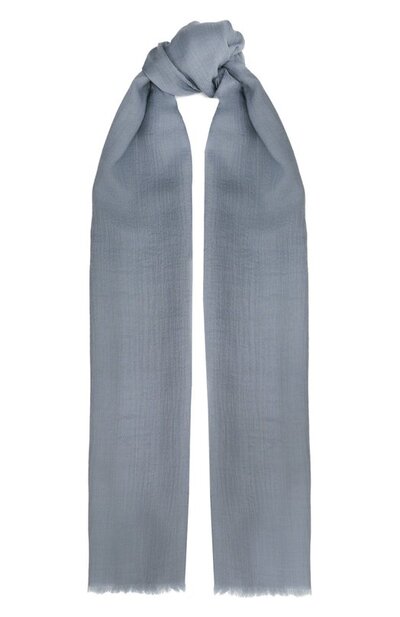 Мастера марки выполнили темно-голубой шарф из нежнейшего кашемира, изготовленного из отборного пуха горных коз. Его вычесали вручную и очистили от грубых волокон, а затем промыли водой из горных родников, поэтому такому материалу нет равных в мягкости. Такая основа полотна гарантирует оптимальный микроклимат, а деликатный блеск добавляет прочный шелк в составе.