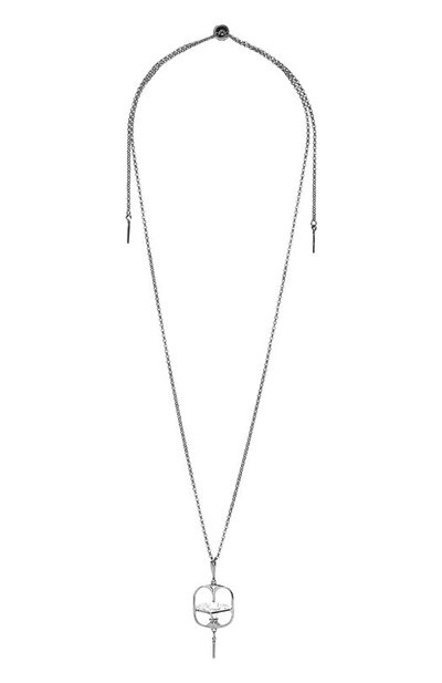 Динамичную скульптурную подвеску украшает вставка из полупрозрачного хрусталя бриллиантовой огранки, который ловит и многократно множит каждый луч света. Для создания ажурного аксессуара использовали ювелирный сплав с гальваническим покрытием серебром. Из такого же материала изготовили тонкую регулируемую цепочку с миниатюрным слайдером.