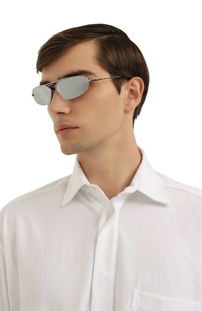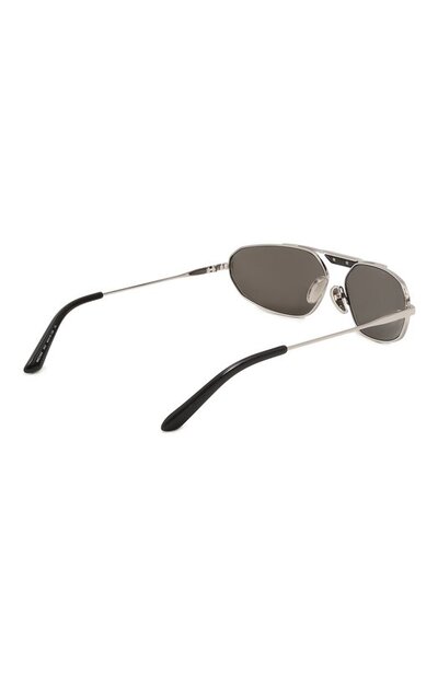 Мастера бренда изготовили очки из легкого прочного серебристого сплава. В тон ему подобрали зеркальное напыление на линзах, которые защищают глаза от вредного ультрафиолета и не пропускают большую часть солнечных лучей. Принадлежность марке обозначили миниатюрным белым логотипом на фигурной детали моста.