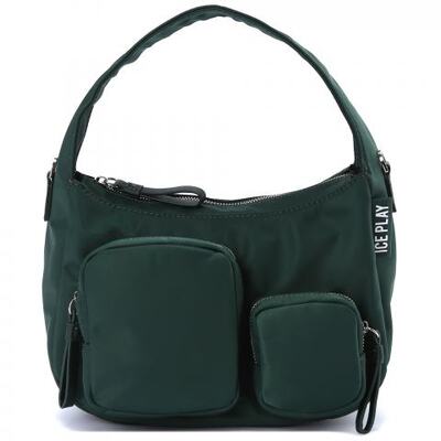 Сумка в зелёном цвете из текстильной ткани от Ice Play. Два накладных кармана спереди, ручка из кожи с регулировкой по длине, в комплекте так же съёмный ремень на плечо на карабинах. Сумка закрывается на молнию, внутри текстильная подкладка и дополнительный карман на молнии.
