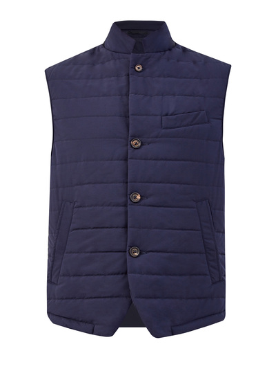 Лаконичный мужской жилет из коллекции Platinum от Eleventy выполнен из премиальной шерсти и влагозащитного матового нейлона Loro Piana. Стеганая отделка и тонкий утепляющий слой делают модель универсальным элементом для составления многослойных образов. Детали: регулируемый пояс, прорезные карманы, застежка на пуговицы, брендированная фурнитура. Сделано в Италии.