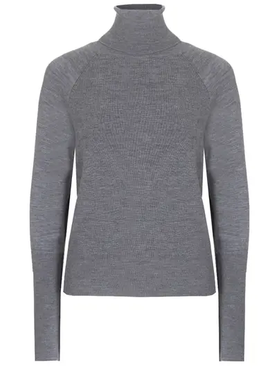 -Серая водолазка из мягкой шерсти от LORENA ANTONIAZZI. -Модель полуприлегающего силуэта с длинными рукавами-реглан, широким рельефным поясом и высоким воротником с отворотом.