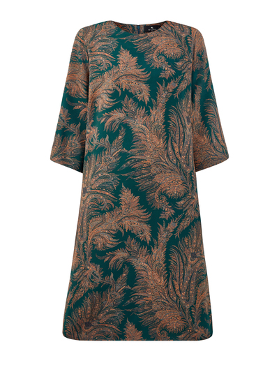 Женственное платье А-силуэта от Etro выполнено из тонкой струящейся ткани с добавлением древесных волокон вискозы. Узнаваемый почерк бренда прослеживается в набивном паттерне с мотивом пейсли. Модель с рукавами ¾, круглой проймой горловины и прорезными карманами дополнена застежкой на потайную молнию на спинке. Сделано в Италии.