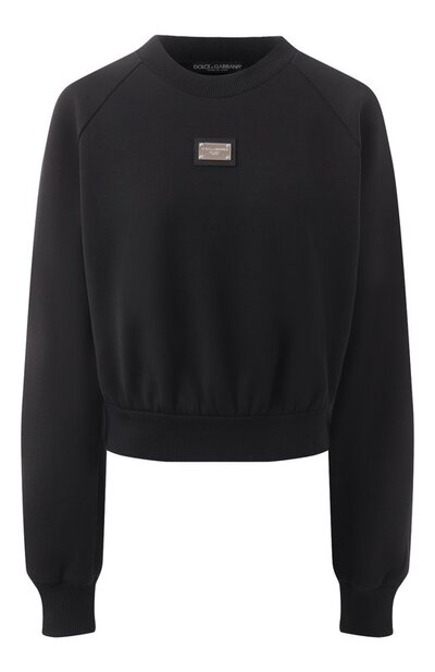 Укороченный черный свитшот с рукавами реглан, словно обтекающими плечи, мастера марки сшили из мягкого хлопкового трикотажа. Приятный на ощупь дышащий материал хорошо удерживает тепло тела, а благодаря добавлению прочного шелковистого полиэстера долго не теряет безупречный вид. Доменико Дольче и Стефано Габбана украсили модель спереди фирменной металлической пластиной с выгравированным логотипом.