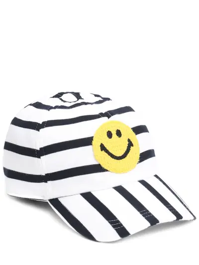 -Полосатая кепка из плотного хлопка от JOSHUA SANDERS. -Модель-шестиклинка с изогнутым козырьком, вязаной аппликацией спереди и регулировкой объема на затылке на липучке.