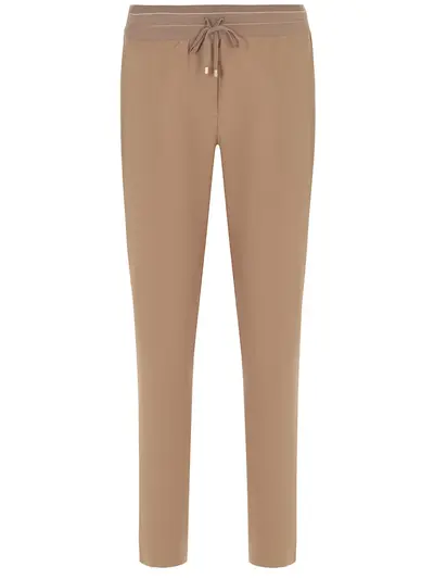 -Бежевые укороченные брюки из тонкой шерсти от LORENA ANTONIAZZI. -Модель длины 7/8 с кроем по фигуре, эластичным трикотажным поясом на кулиске для выбора комфортной высоты посадки, четырьмя прорезными карманами. -Брюки сочетаются как с легкими блузами и туфлями, так и с трикотажем и обувью на плоском ходу.