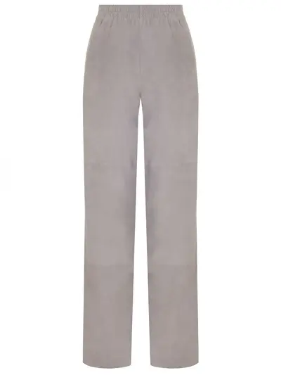-Серые брюки из фактурной мягкой замши от DESA. -Модель прямого кроя с эластичным поясом для выбора комфортной высоты посадки, прорезными и накладными карманами.