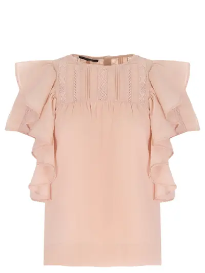 -Блуза из хлопка персикового цвета от HIGH. -Фактурная модель полуприлегающего кроя с короткими рукавами, круглым вырезом горловины, пышной отделкой на рукавах и застежкой на пуговицы на спинке.