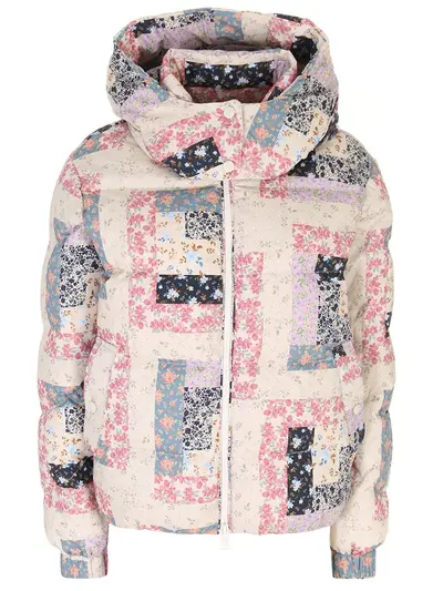 -Стеганый пуховик с цветочным принтом, стилизованный под технику пэчворк, от WOOLRICH.