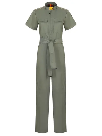 -Зелёный комбинезон в стиле милитари купажированного состава от PARAJUMPERS. -Модель свободного кроя с прямыми брюками, короткими рукавами, прорезными и накладными карманами, воротником-стойкой, застежкой на молнию.