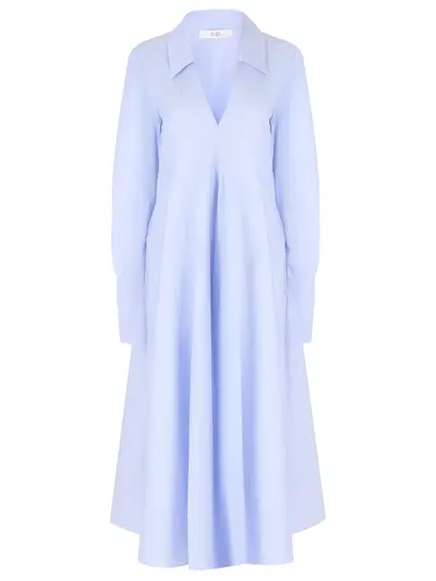 -Модель с завышенной талией, длинными рукавами с широкими манжетами и глубоким V-образным вырезом делает женственнее расклешенный подол, задрапированный объемными складками.