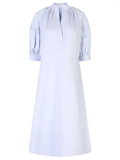 -Модель с акцентом кроя на высокой отрезной талии, спущенной линии плеча, объемными рукавами длины 1/2 с манжетами, V-образным вырезом на груди и воротником-мандарин.