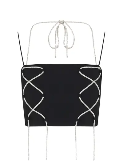 -Черный топ из вискозы от GIUSEPPE DI MORABITO. -Модель облегающего кроя с узкими бретелями на плечах, бретелью-халтер и контрастной шнуровкой спереди.