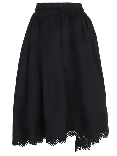 -Черная юбка-миди из хлопка от HIGH. -Модель с высокой посадкой на талии, расклешенным кроем ярусного подола асимметричным по длине, в котором ткань ложится крупными волнами-складками. -Фестончатый низ юбки оформлен аккуратным шитьем.