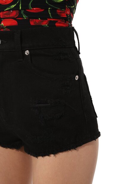Черные короткие шорты с крупными потертостями выглядят так, будто их перешили из джинсов. Иллюзию формируют обрезанные вручную необработанные края с бахромой. Для пошива модели использовали мягкий фактурный хлопок. Изделие украсили сзади брендированной пластиной.