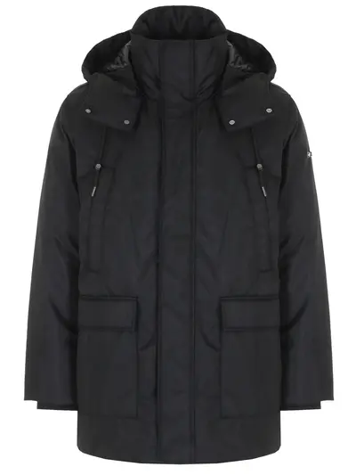 -Черная парка с натуральным пуховым наполнителем от ADD. -Модель свободного кроя с длинными рукавами, манжетами, прорезными и накладными карманами, воротником-стойкой, капюшоном с кулиской и ветрозащитной планкой, застежкой на молнию и кнопки.