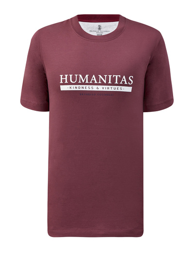 Мужская футболка от Brunello Cucinelli выполнена из премиального хлопка джерси в приглушенном винном оттенке. Гладкий дышащий материал с полностью натуральным составом идеально подходит для создания повседневных образов, сезонный принт Humanitas отражает философию Модного Дома. Детали: круглый вырез горловины, короткие рукава, простроченные швы. Сделано в Италии.