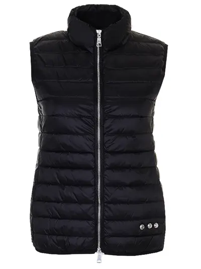 -Черный стеганый жилет с натуральным пуховым наполнителем от ADD. -Модель облегающего кроя с прорезными карманами, воротником-стойкой, застежкой на молнию. -Благодаря стежке наполнитель равномерно распределен внутри изделия и лучше сохраняет тепло.