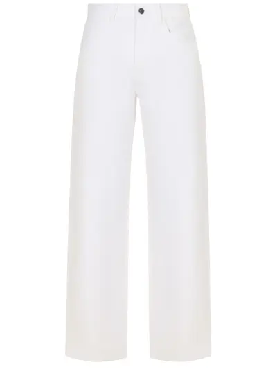-Белые джинсы из хлопка от JULI TOO. -Модель свободного прямого кроя с завышенной посадкой, поясом со шлевками, прорезными и накладными карманами с нашивкой логотипа бренда, застежкой на молнию и пуговицу, разрезом сзади.
