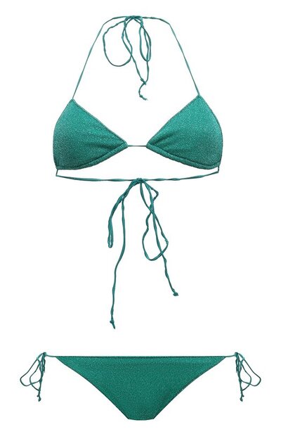 Раздельный купальник яркого бирюзового цвета особенно эффектно выглядит в лучах солнца: в быстросохнущий материал вплели сверкающие металлизированные нити. Посадку плавок и лифа с мягкими треугольными чашечками удобно регулировать длинными завязками.