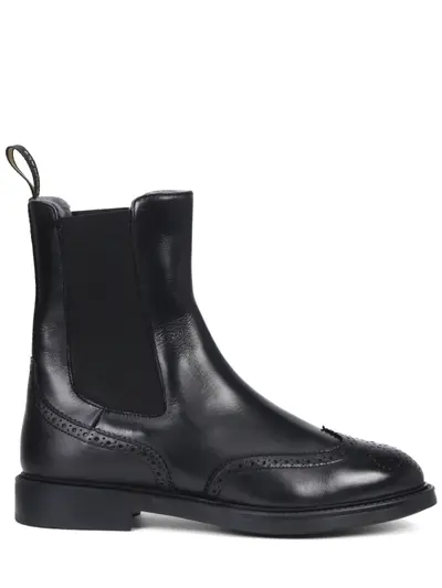 -Модель с округлым мысом, толстой резиновой подошвой и низким каблуком, эластичными боковыми вставками, логотипированной петлей на заднике, брогированием деталей, внутренней отделкой из натуральной стриженой овчины.
