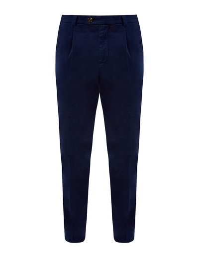 Мужские брюки свободного зауженного кроя от Brunello Cucinelli выполнены в лаконичном синем оттенке. Минималистичный дизайн подчеркивает эластичный хлопковый габардин с добавлением ценных волокон кашемира, заложенные складки придают образу расслабленное настроение в стиле sprezzatura. Детали: застежка на роговую пуговицу с крючком и молнией, притачной пояс с петлями для ремня. Сделано в Италии.
