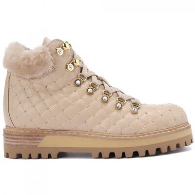 Треккинговые ботинки из кожи от Le Silla — это роскошная зимняя обувь, полностью изготовленная вручную в Италии из высококачественных материалов. Эти ботинки выделяются верхом из мягкой бежевой телячьей кожи со стёганым узором и шнуровкой. На щиколотке видна тёплая подкладка из овчины. Универсальный цвет и выбранные материалы делают их подходящими для того, чтобы стильно выдержать холод. Модель дополнена резиновой подошвой с выступами высотой 40 мм. и меховыми подкладкой и стелькой.