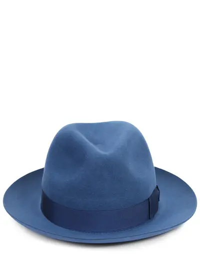-Синяя шляпа из фетра на основе шерсти от BORSALINO. -Широкополая модель с классической тульей, которую подчеркивает широкая репсовая лента с логотипом.