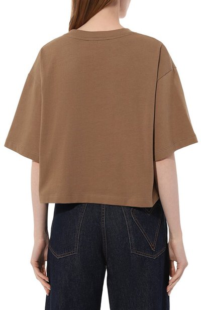 Свободную укороченную футболку карамельного оттенка мастера марки сшили из мягкого хлопкового джерси. Приятный на ощупь дышащий материал почти не ощущается на теле, поэтому в изделии будет комфортно весь день. Спереди модель украсили крупной тисненой эмблемой бренда.