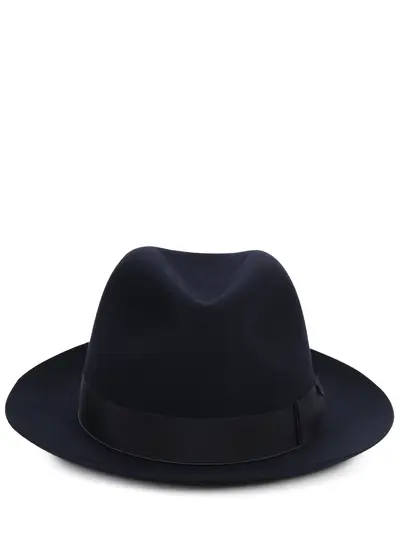 -Темно-синяя шляпа из фетра на основе шерсти от BORSALINO. -Модель со средними полями и тульей, которую подчеркивает широкая репсовая лента в тон с логотипом.