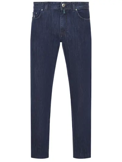 -Синие зауженные джинсы из хлопка от LUIGI BORRELLI. -Крой по фигуре, средняя посадка, пояс со шлевками, прорезные и накладные карманы, застежка на молнию и пуговицу, нашивка с логотипом бренда.