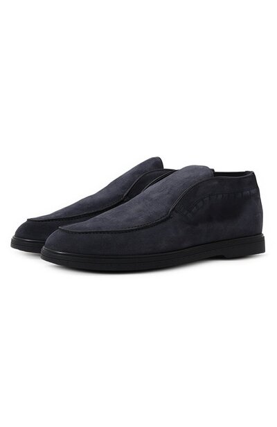Для изготовления темно-синих ботинок мастера марки, основанной Стефано Риччи, использовали мягкую замшу. Тонкая ручная выделка сохранила природную прочность материала и сделала его эластичным, поэтому обувь удобно облегает стопу. За комфорт при ходьбе отвечает гибкая нескользящая подошва. Боковые панели украсили рельефным узором, вдохновленным бамбуковыми стеблями.