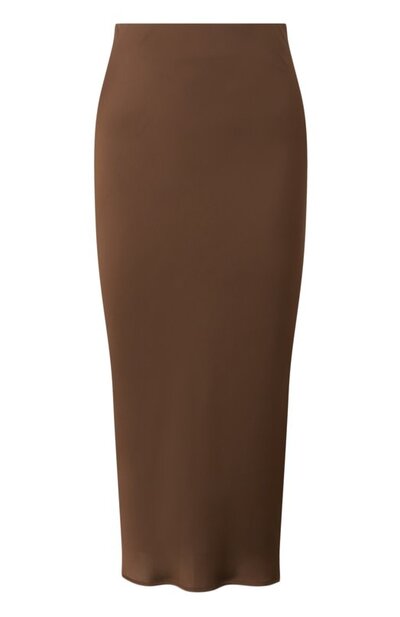 Для пошива коричневой миди-юбки с боковыми разрезами мастера марки, основанной Брунелло Кучинелли, использовали гладкий легкий атлас Soft. Материал переливается деликатным шелковистым блеском, делая оттенок изделия более глубоким. Нам нравится сочетать модель с бежевой блузой и кремовыми балетками.