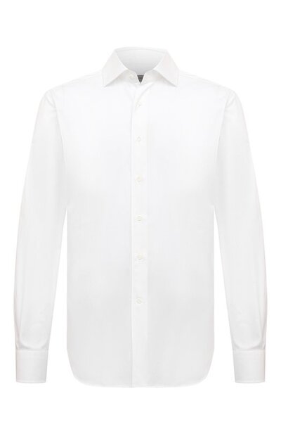Чистый белый цвет позволяет этой сорочке стать хорошим компаньоном для костюма любой гаммы, а крой обеспечивает удобную и точную посадку по фигуре. Модель с воротником акула мастера марки выполнили из шелковистого хлопка с фактурным микроузором. Для производства ткани отобрали только длинные волокна, которые сделали материал прочным и мягким.