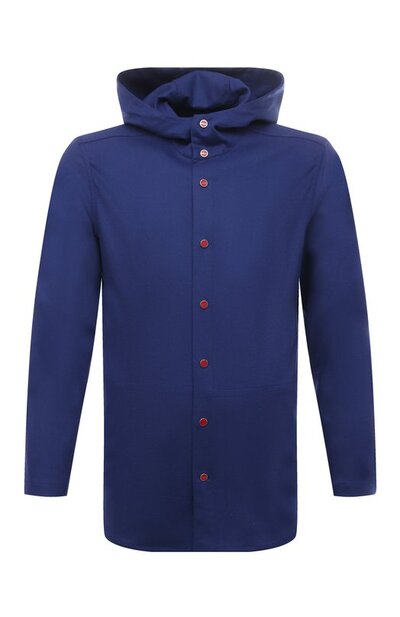 Синяя рубашка с глубоким капюшоном станет альтернативой легкой куртке в прохладную погоду. Для пошива модели с длинными рукавами использовали нежный, почти невесомый кашемир, произведенный из отборного пуха тонкорунных горных коз. Сырье тщательно промыли вручную в родниковой воде и обработали ворсовальными шишками для придания особой мягкости.