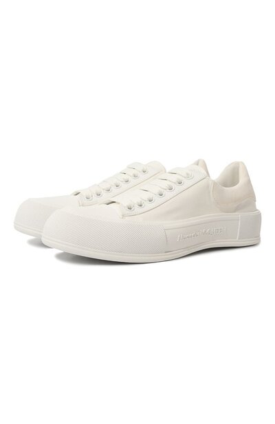 Для изготовления белоснежных кедов Deck Plimsoll мастера марки, основанной Александром Маккуином, использовали прочную хлопковую парусину, для отделки – бархатистую замшу. Широкую подошву с накладкой, защищающей мыс от повреждений, декорировали сбоку рельефным логотипом. Такой же мотив есть на высоком заднике.