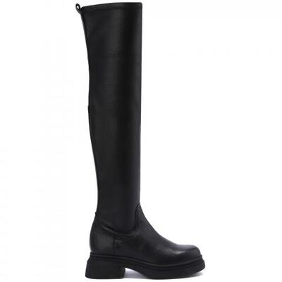 Высокие сапоги из искусственной кожи от ANNA RACHELE. Пара в чёрном цвете универсальная и подойдёт к любому образу и стилю. Сапоги выполнены из мягкой и эластичной искусственной кожи, на высокой резиновой подошве с каблуком 50 мм. Внутри кожаные подкладка и стелька. Благодаря эластичному голенищу, идеально облегающему ногу, сапоги будут прекрасно смотреться в образах с короткими шортами или юбкой.