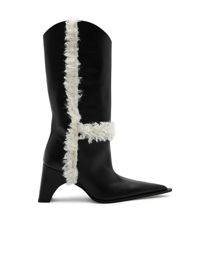 Кожаные сапоги COPERNI выполнены из натуральной кожи черного цвета с меховой отделкой. Модель с заостренным мысом и скошенным каблуком.