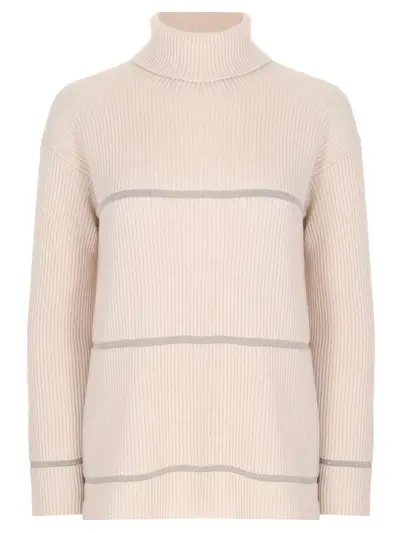 -Бежевый вязаный свитер из смесовой шерсти от TONET. -Модель свободного силуэта с фактурной вязкой, спущенной линией плеча, длинными рукавами, высоким воротником с отворотом, вышивкой металлизированной нитью.